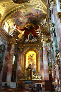 We next visited some interesting and very stylistically different churches. The first was one of the most famous churches in Austria, St. Stephen's Cathedral. The tiled roof is very beautiful - the inside didn't stand out for me in any major way from the other Gothic-style churches we've been to. Apparently the tall south tower took 65 years to build, and they were going to build the north tower as tall but by the time they started, this look for churches had gone out of vogue!